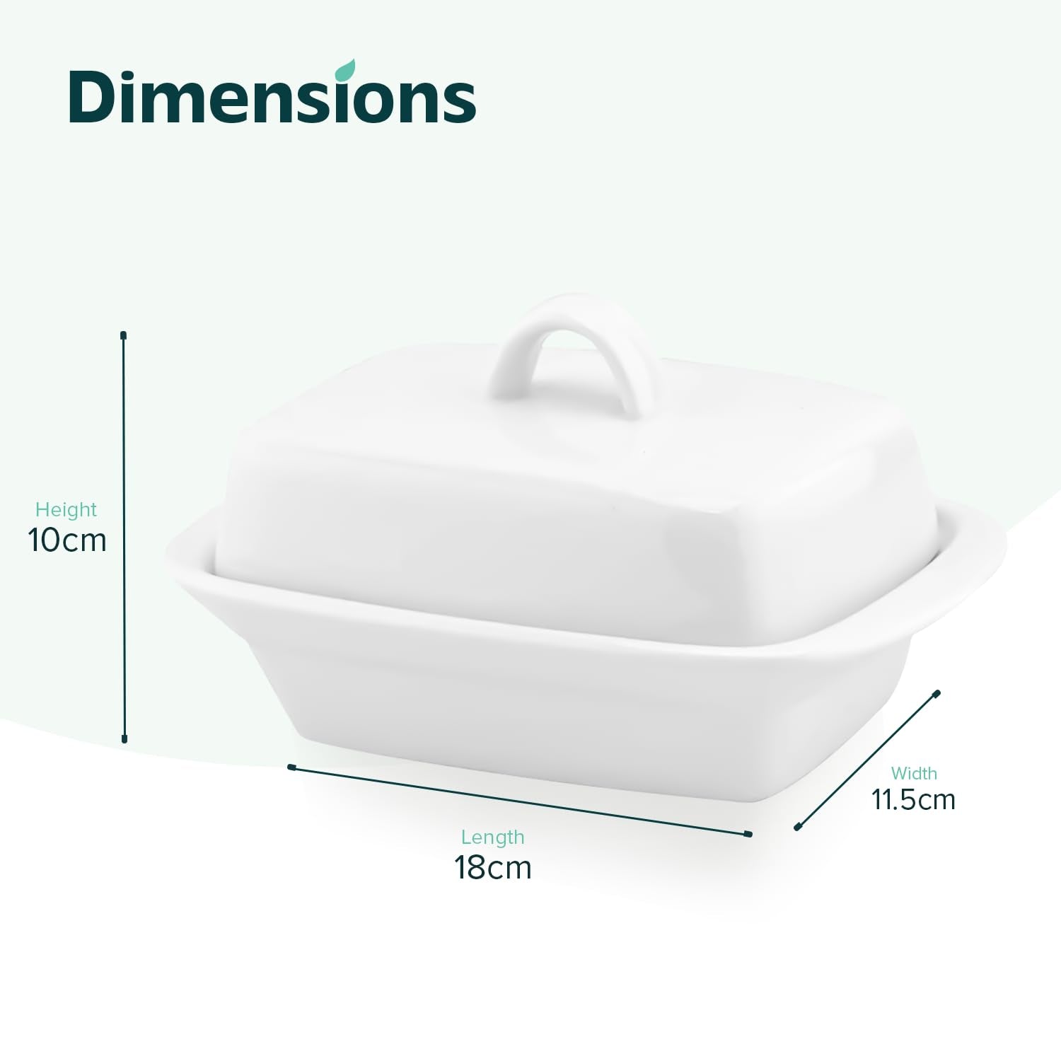 Introducing our Ceramic Butter Dish with Lid, a stylish and functional butter container perfect for your kitchen. This large, white butter dish measures 17.5L x 9W x 11.5H (cm) and accommodates up to 650ml of butter, making it ideal for square-sized European butter.