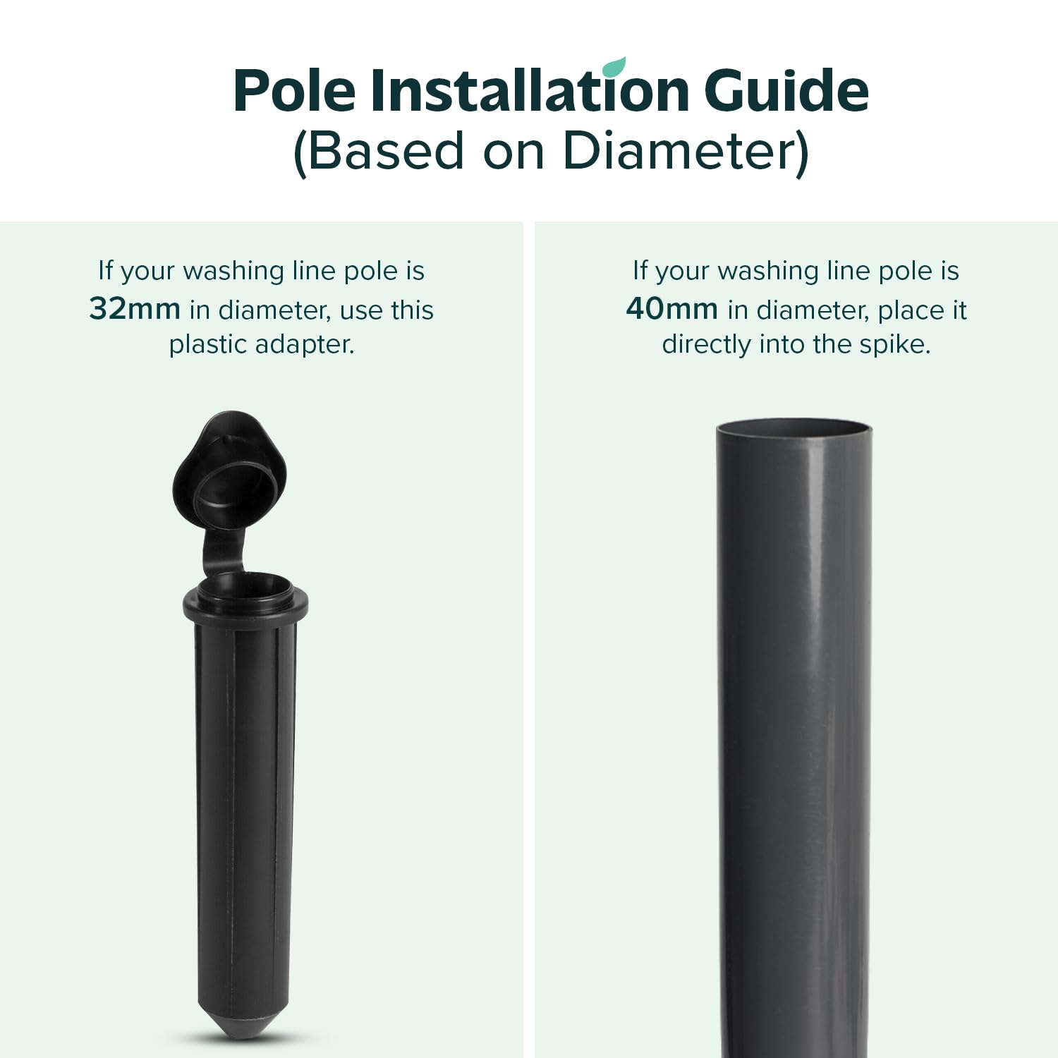 - FOR ALL STANDARD POLES: Our Strong and sturdy powder coated Alloy metal rotary washing line spike is a multi-fit spike with height 39cm, perfect to be used with rotary Airer or other standard poles that have 40mm diameter; strong plastic adapter is available to help 32mm and 40mm both rods or poles to set in the spike