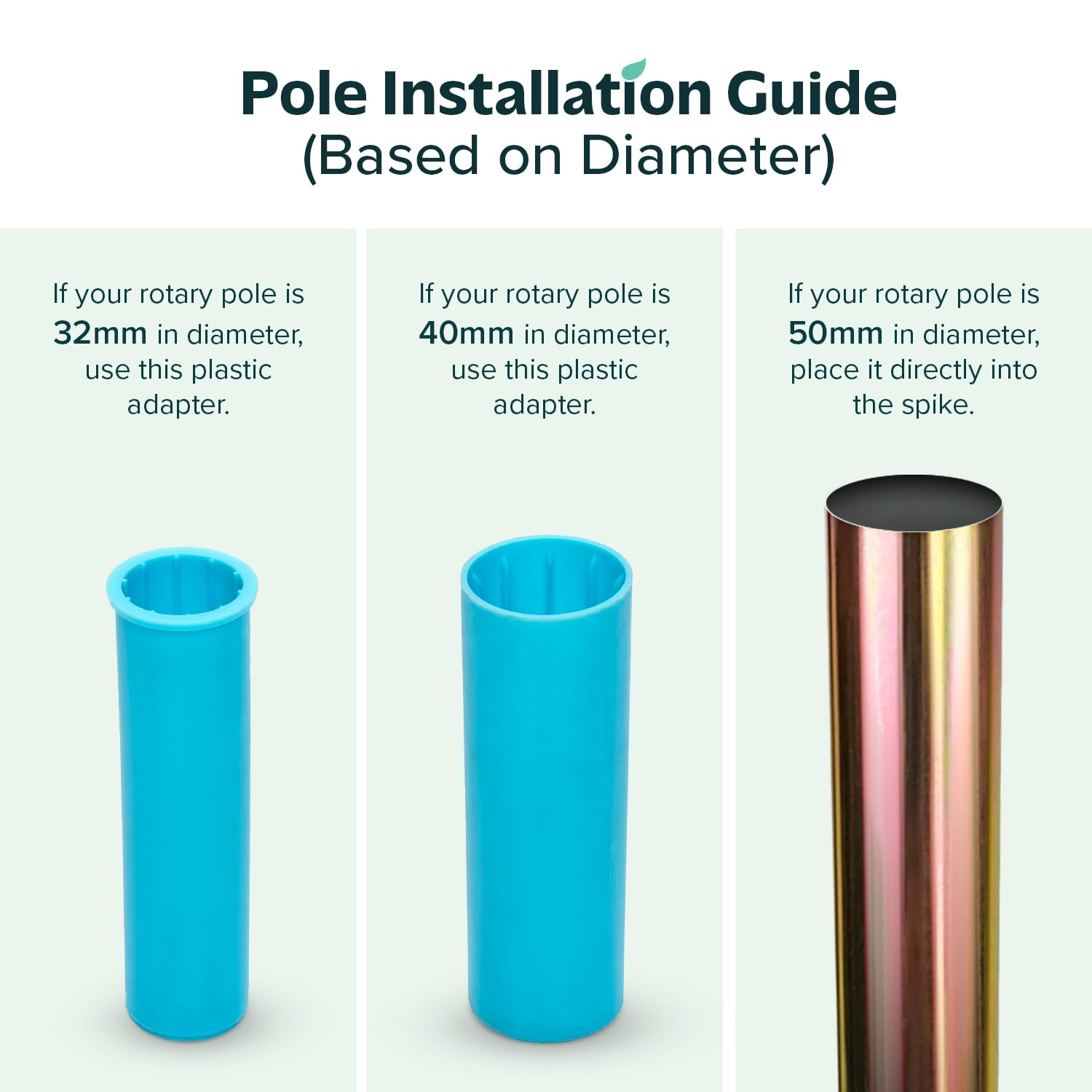 - FOR ALL STANDARD POLES: Our Strong and sturdy galvanized metal rotary washing line spike is a multi-fit spike with height 39cm, perfect to be used with rotary Airer or other standard poles that have 32mm, 40mm, and 50mm diameter; strong plastic adapters are available to help 32mm, 40mm and 50mm rods or poles to set in the spike;
