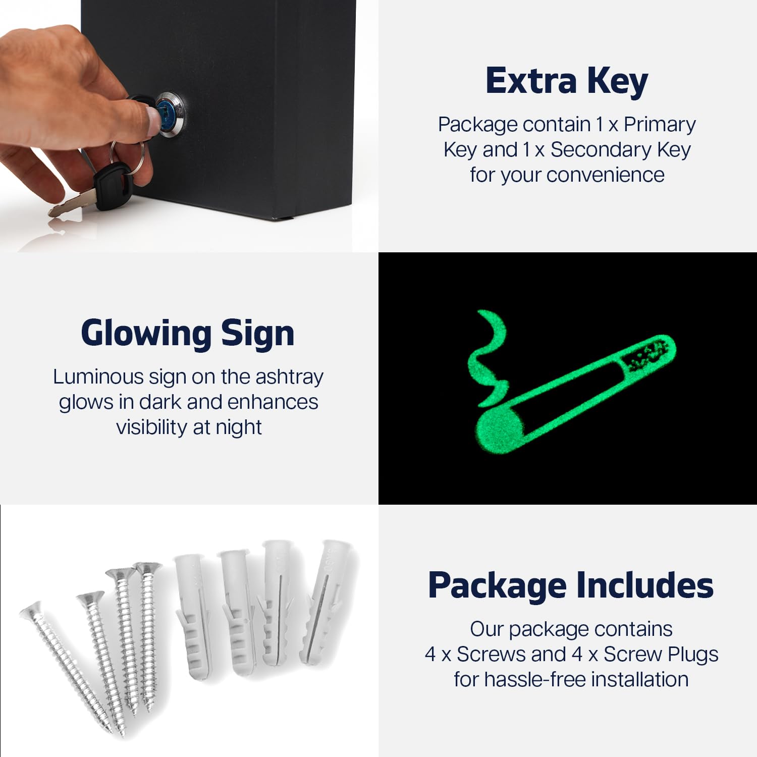 - Compact Design: The luminous cigarette sign on this outdoor ashtray glows in the dark and enhances visibility at night; A lockable wall ash bin is a perfect accessory for your home, office, restaurant, pub and other smoking areas