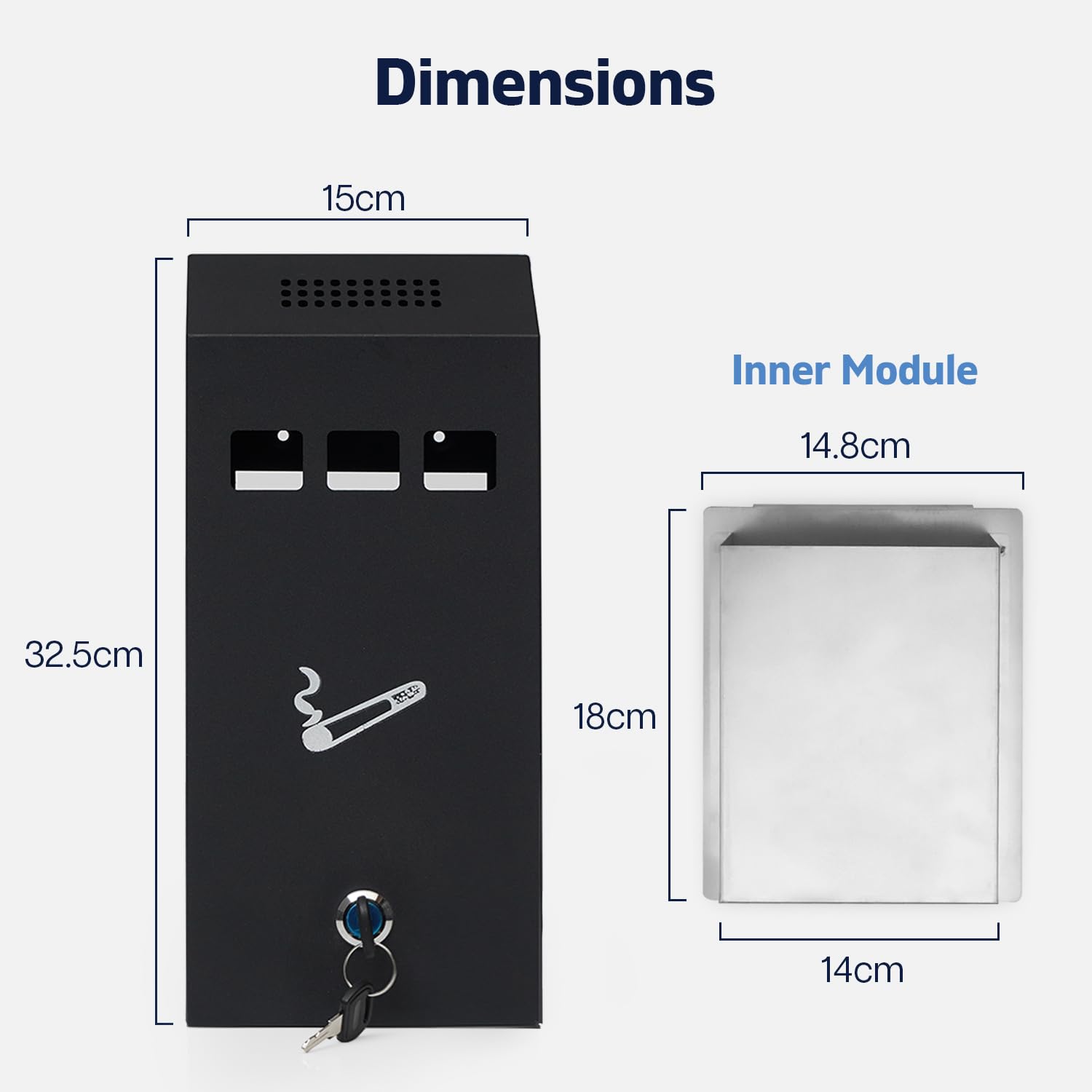 - Dimensions: Black ashtrays wall mounted measure H 32cm x W 15cm x D 7cm approximately; Our Package contains all necessary installation accessories, i.e., 4x screws, 4x wall plugs and 2 keys