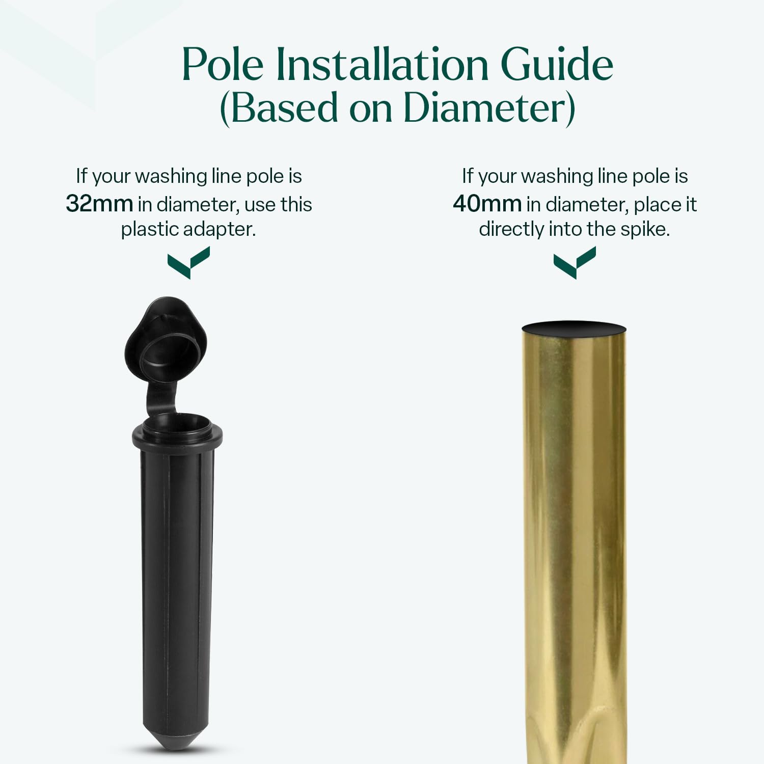 - Compatibility: This Golden washing line spike comes with a black plastic adapter that seamlessly accommodates both 40mm and 32mm diameter poles, providing flexibility to suit various pole sizes and setups