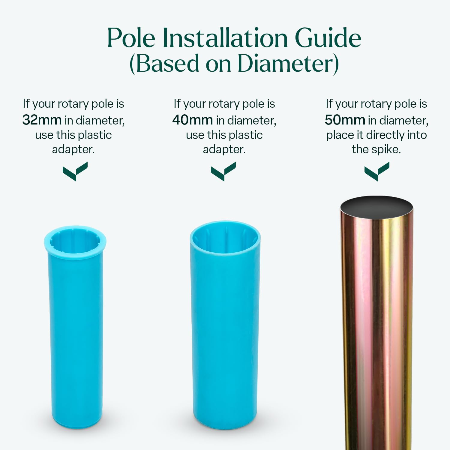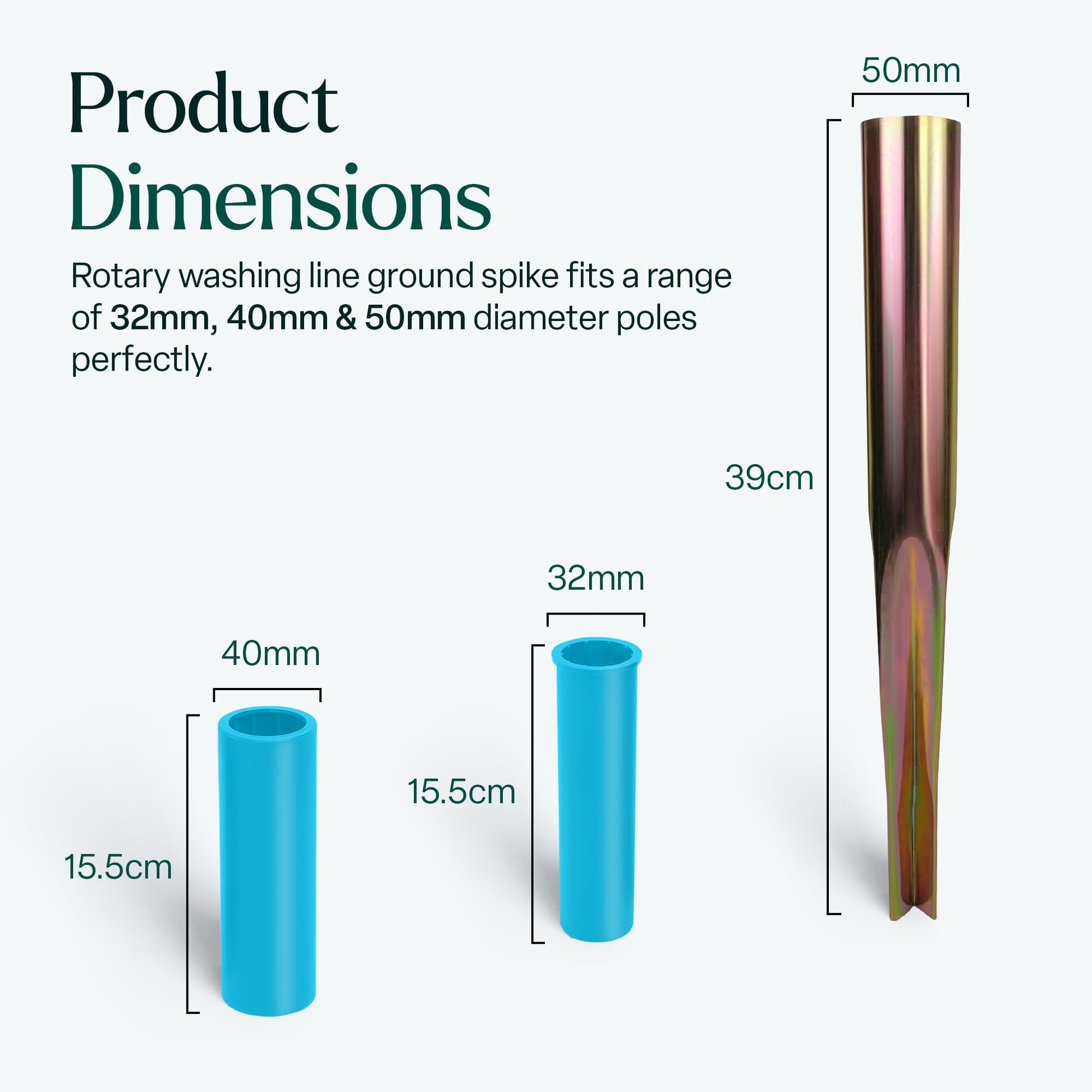 - Standard Dimensions: Our Strong and sturdy metal spike height 390mm can be used with rotary airer or other poles having diameter of 32mm, 40mm and 50mm; Use plastic adapters with rotary line ground spike if the diameter of the rod is 32 mm and 40mm; if rod's diameter is 50 mm
